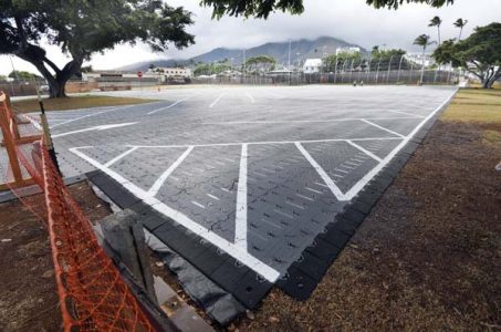 A recently completed temporary parking lot covers the baseball field at Wailuku’s Wells Park Thursday afternoon. The approximately 3,600-square-foot lot was installed to make up for the capacity displaced due to construction at the Wailuku Municipal Parking Lot. The interlocking system is by Supa-Trac. Lines were painted after the installation.