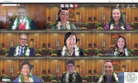 - For the first time, the Maui County Council’s inauguration was held virtually Saturday. Members are (from upper left) Shane Sinenci, Keani Rawlins-Fernandez, Tamara Paltin, (middle row left) Mike Molina, Kelly King, Yuki Lei Sugimura, (bottom left) Tasha Kama, Alice Lee and Gabe Johnson. Maui County Council photo