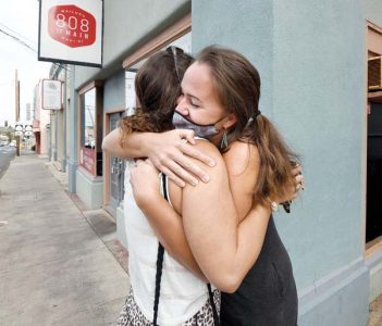 Ellie Shellooe (right) hugs friend Natalie Nichols goodbye last week along Main Street in Wailuku. Shellooe said that after growing up on Maui, the economic downturn caused by COVID-19 is forcing her to move to Las Vegas for a job in the tourism industry. “There’s definitely a lot of feelings,” she said. After being furloughed for nearly a year, she said, her position with Diamond Resort was recently eliminated. “I’m spreading my wings,” she said. “I have a job starting four days after I get in.”