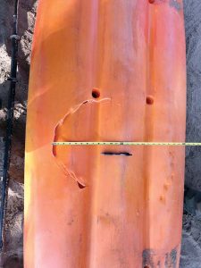 - Shark bite marks can be seen on the Sullivan family’s kayak following an encounter with a shark Tuesday. State Department of Land and Natural Resources photo