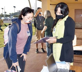 - Baldwin High Student Services Coordinator Janina Amaral goes over a health check with senior Lala Nardi before classes Thursday, while clerk Carole Satoshige takes Jerren Manarpaac’s temperature. The Maui News / MATTHEW THAYER photos