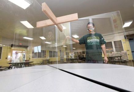 - Baldwin High School Food Service Manager Reid Ouchi stands by one of the X-shaped Plexiglas shields that divide cafeteria tables into quarters on Thursday. Baldwin began welcoming back its seniors this week and plans to bring juniors back to campus later this month.