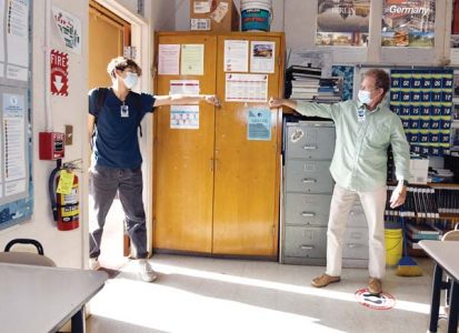 - Social studies teacher Scott Clarke gives senior Shandon Obregon a virtual fist bump in his classroom Thursday.