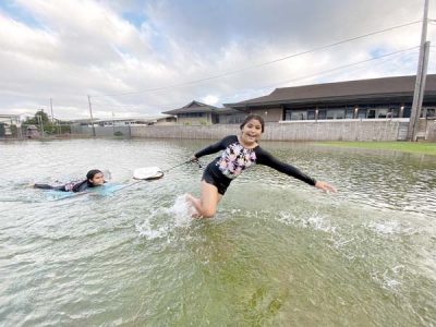 Second photo: Hawaiian Mission Academy Maui students Natalie Luwalhati (left) and Marley Baker play in the flooded yard fronting their school in Kahului on Saturday afternoon. Record rainfall in the area turned places like the schoolyard and the adjacent parking lot of the Kahului Seventh-day Adventist Church into a shallow lake.