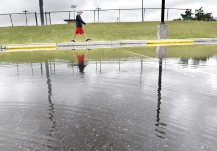 A walker passes a large puddle at Keopuolani Park on Tuesday. Rainy and stormy weather continued for Maui County with over 9 inches of rain in some parts of Maui and Molokai on Wednesday and a wind advisory for Lanai through Wednesday night. A high surf advisory was also extended through 6 p.m. today for east-facing shores of Maui and Molokai. The Maui News / MATTHEW THAYER photo