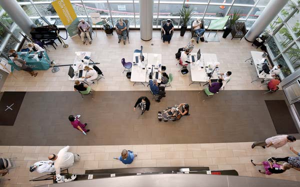Health workers administer vaccines in the lobby of Maui Memorial Medical Center in January. Vaccine clinics statewide expanded eligibility on Monday to Phase 1c, the largest group under the state’s vaccination plan. The Maui News / MATTHEW THAYER photo