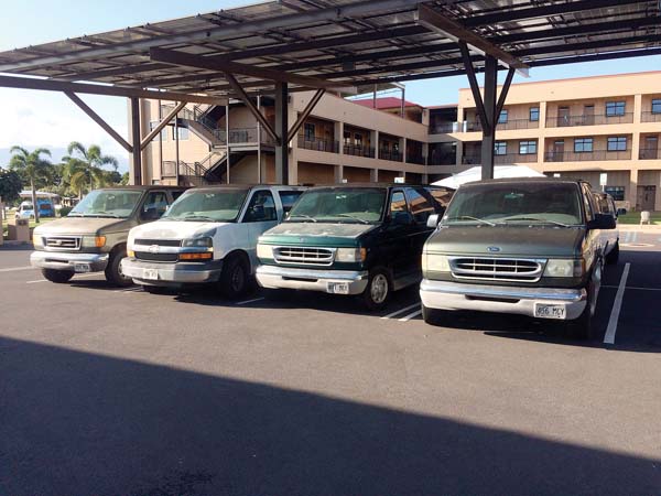 Passenger vans sit in the parking lot of Kihei Charter School. Thieves stole the catalytic converters from four of the vans about two weeks ago, leaving the school with a hefty bill and a limited fleet of vehicles. Photo courtesy of Gene Zarro