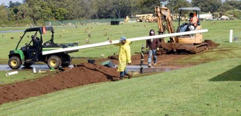 - Willie Taroma of Kihei Garden Center carries a length of 4-inch pipe while working as part of a crew putting in a new main waterline at Maui Veterans Cemetery in Makawao in early March. Long-awaited expansion and improvement work is now ongoing at the cemetery and is scheduled to be completed around September, while a project to add 640 columbarium niches and a memorial wall is slated for completion in December, the state Office of Veterans’ Services said this week. The Maui News / MATTHEW THAYER photo