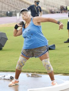 Competing alongside athletes who are nearly 60 years younger, Kihei decathlete Mary Trotto, 74, puts some muscle into tossing a four-kilogram shot put at the Valley Isle Track Club Open Track Meet Championship at the Satoki Yamamoto Track & Field Facility at War Memorial Stadium on Saturday. Trotto won the 19-over women’s division as the only entrant with a distance of 19-feet-6-inches. Trotto, who has won multiple national titles since taking up the sport of track and field at the age of 55, was the first woman to complete a sanctioned decathlon event when she accomplished the feat in 2004. She said she is looking forward to turning 75 next year so she will be among the youngest competitors in her national age group.