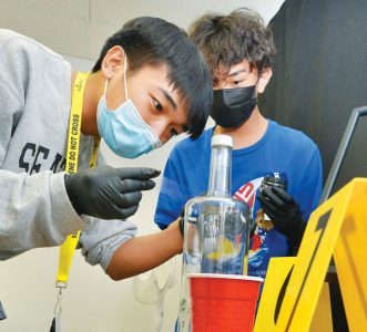 FIRST PHOTO: Maui High School senior Norlito Ranches, 16, uses tape to lift fingerprints from a bottle at a simulated crime scene after fellow Maui High senior Leejae Daguio, 16, dusted to locate the prints Wednesday afternoon at the County of Maui Forensic Facility in Wailuku. The duo took part in Maui Police Department – County of Maui CSI (Crime Scene Investigation) Camp, where students from around Maui and other islands completed 40 hours of instruction over the course of a week.