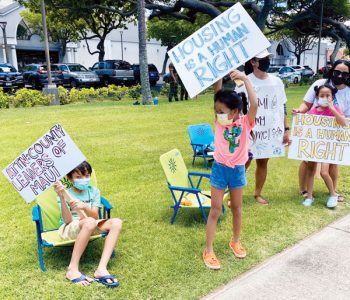 - The Tacderan family holds signs during a Stand Up Maui Affordable Housing Rally from noon to 1 p.m. in Kahului.
