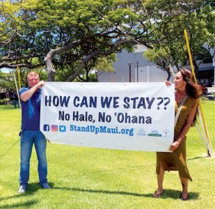 - Matt Bachman, Kihei resident and Habitat for Humanity family services director, along with community activist Kai Nishiki, hold a sign that says, “How can we stay??” during the Stand Up Maui Affordable Housing Rally from noon to 1 p.m. fronting Queen Ka‘ahumanu Center in Kahului. The nonprofit Stand Up Maui advocates for affordable housing, immigration and other social justice issues.