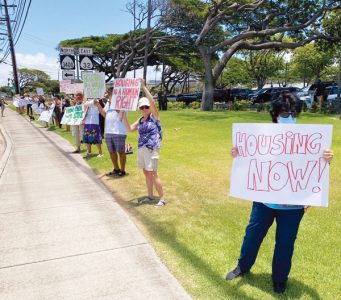 “Build affordable housing now,” Maui resident Faith Chase yelled through a bullhorn at the rally. “No more studies.”
