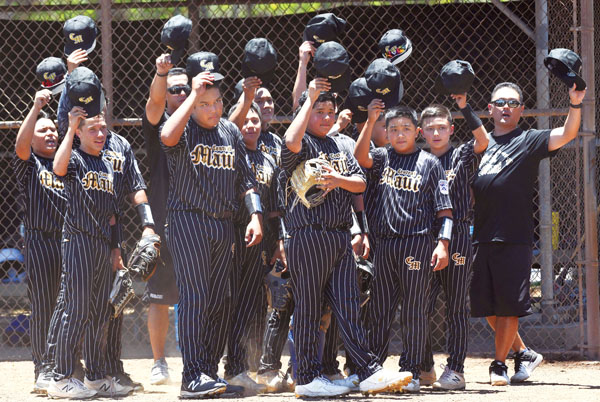 Central East Maui players and coaches doff their caps to Kawaihau after their come-from-behind victory Monday at Dorvin Leis Field in Kihei. For more on the Hawaii State Little League Majors State Tournament, see Sports.