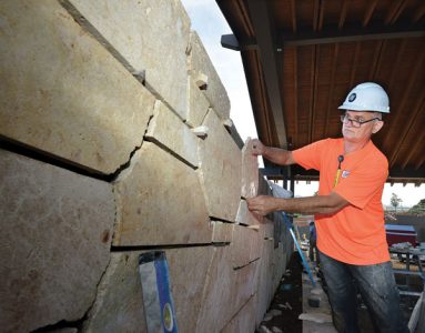 Eugene Ramanov, a mason for Hilltop Contractors, fits a piece of coral stone onto a wall at the AC Hotel by Marriott Maui Wailea in February. Mayor Michael Victorino vetoed a bill on Tuesday that would place a moratorium on visitor accommodations development in West and South Maui. The Maui County Council, which passed the bill on July 2, must now decide whether it plans to override the veto. The Maui News / MATTHEW THAYER photo