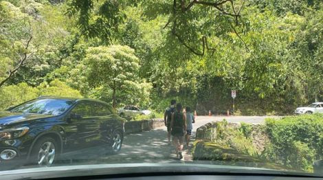 - A group of people walk across a one-lane bridge near Waikamoi Falls in East Maui on July 8, blocking traffic on both sides. — The Maui News / COLLEEN UECHI photo