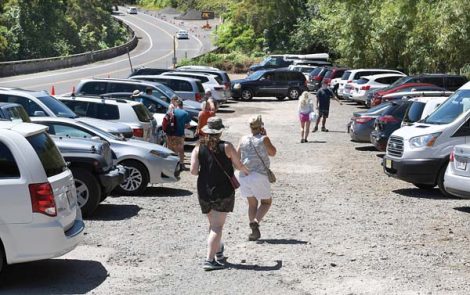 - Visitors to Twin Falls make their way across the parking lot in June. State officials are mulling solutions to overcrowding along Hana Highway, including creating a park-and-ride shuttle service and urging visitors to book a tour instead of driving themselves. — The Maui News / MATTHEW THAYER photo