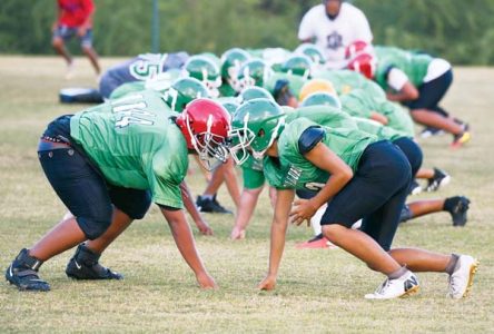 - Members of the Wailuku Rainbows 14-and-under team square off for the blocking drill during practice Sept. 7 at Keopuolani Park. Mayor Michael Victorino announced Friday that spectators will be allowed to attend youth sporting events not sanctioned by the state Department of Education, so long as they following gathering, masking and social distancing rules. — The Maui News / MATTHEW THAYER photo