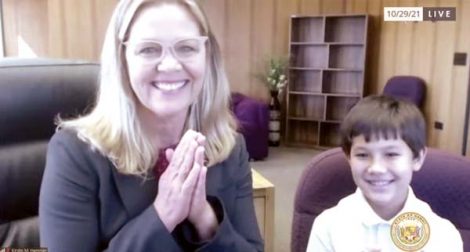 She appeared by Zoom with her son Mason Ouchi and acknowledged students in his fifth grade class at Pomaikai Elementary who were watching with their teacher Chynna Kitagawa.