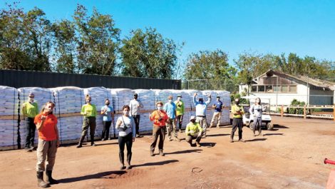 - The MISC coqui crew smiles for a photo after delivering large containers of powdered citric acid at the Old Maui High School campus, the organization’s new base yard where they have a temporary agreement to house equipment and supplies for invasive species control efforts, such as the little fire ant project, invasive plants, and coqui frog control.