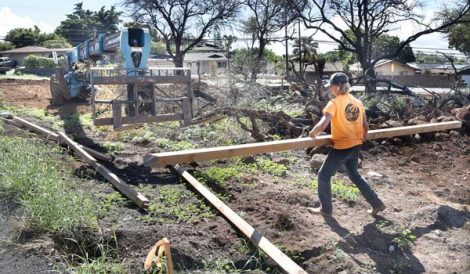 - Betsil Brothers laborer John Cavness loads four-by-four dust fencing posts onto a boom lift Tuesday afternoon at the Hale Kaiola project in North Kihei. The project is currently taking applications for 40 two- and three-bedroom units in 20 duplex buildings. It’s considered one of the 36 “priority projects” in Maui County’s affordable housing plan that aims to bring about 5,000 units online in the next five years.