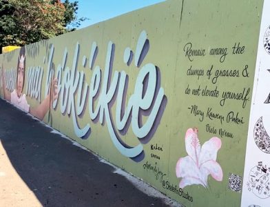 Maui artist Amanda Joy Bower’s mural titled Ha‘aha‘a, stands at the future location of the proposed Halau of ‘Oiwi Art. It will be adjacent to the new four-level parking structure in Wailuku town, currently under construction at the corner of Church and Vineyard Streets. County of Maui / Shane Tegarden