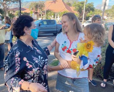 - Maui County’s First Lady Joycelyn Victorino greets Dasha Schmidt, who is formerly of Ukraine and now lives on Maui, along with 2-year-old Kaimana. The Schmidts were wearing vyshyvanka, or a traditional Ukrainian blouse known for its embroidery. Schmidt said her mother is hunkered down in a basement in Ukraine.