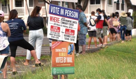 - Voters stand in line to cast their ballots outside the Velma McWayne Santos Community Center in November of 2020. A slate of charter amendments headed for the general election ballot in November includes a proposal to change how council members are elected. — The Maui News / MATTHEW THAYER photo