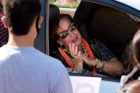 Haiku Elementary School kindergarten teacher Monica Nakahashi greets supporters during a rally in September 2020. Students, parents and co-workers protested after Nakahashi was placed on leave pending an investigation, which her family said occurred after Nakahashi filed a complaint about the administration. The family and the state Department of Education confirmed this week that Nakahashi had been cleared under the investigation. The Maui News / COLLEEN UECHI photo