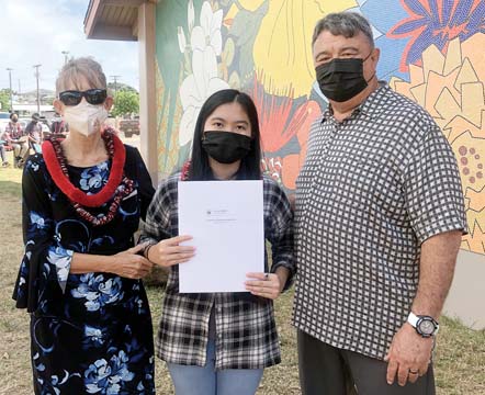 - Eighth-grade student Leigh Aguiran (center) receives Gov. David Ige’s certificate as Maui County 2022 grand prize winner of the Dr. Martin Luther King Jr. Peace Poetry Contest. The ceremony took place at Maui Waena Intermediate school. Presenting the award is Baldwin-Kekaulike-Maui Complex Area Superintendent Jamie Yap (far right), and Contest Director Melinda Gohn. — Photo courtesy of the Dr. Martin Luther King Jr. Peace Poetry Contest