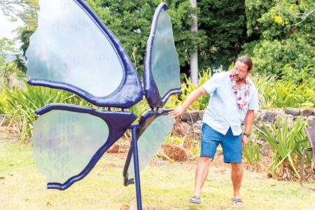 Arizona sculptor Bobby Zokaites discusses his new art installation, “Wailuku Wings,” during an unveiling and blessing of the piece on June 20 at the Imua Discovery Garden in Wailuku. It’s the latest work of public art under the Small Town Big Art initiative and was developed in response to a 2021 call-to-artists by Small Town Big Art and Imua Family Services. Zokaites developed the 8-foot sculpture with steel framing and colorful polyurethane paneling over the course of four months and in consultations with local community members. It is inspired by the olelo no’eau “I mohala no ka Lehua i ke ke’eke’ehi ‘ia e ka ua.” (Lehua blossoms unfold because the rains tread upon them. It is the rain that brings forth the lehua blossoms. So do gentle words bring forth much that is desired.)