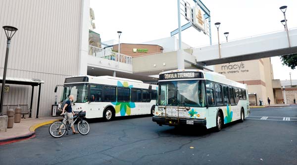 Buses pull up to the transit hub at the Queen Ka‘ahumanu Center in 2019. County officials have been planning to relocate the transit hub to a site near the mall. The county’s top transportation official said Monday that the new transit hub, which is currently under construction, could be completed by the end of this year. The Maui News / MATTHEW THAYER photo