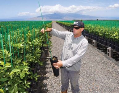 - Native Nursery co-owner Ethan Romanchak examines a Tahitian lime tree in the growing company’s Kula operation Tuesday afternoon. The healthy start is destined for a Mahi Pono field.