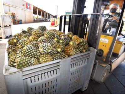 - Maui Gold Pineapple Co. forklift operator Evelyn Kennison transports a bin of Maui Gold pineapples to cold storage Tuesday morning in Haliimaile. The Maui News / MATTHEW THAYER photo