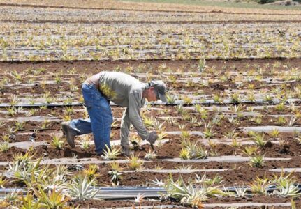 - With steady grace, Loreto Andres plants pineapple crowns by hand in a Maui Gold Pineapple Co. field Tuesday morning in Haliimaile. Andres started working island agriculture back in the day with Maui Pineapple Co. He gets paid per crown he plants