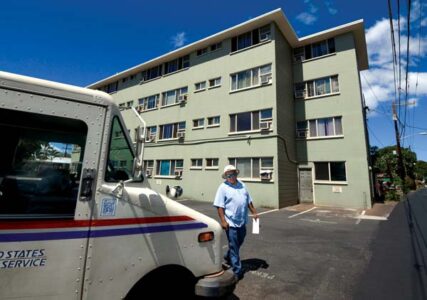 Lahaina letter carrier Lester Natividad returns to his vehicle after dropping off mail at the Lahaina Crossroads Apartments Tuesday morning on Luakini Street. The Maui County Council voted on Tuesday to allow the county to use up to $11 million to purchase the apartments in hopes of saving the housing for residents who were told to vacate the complex earlier this year. The Maui News / MATTHEW THAYER photos