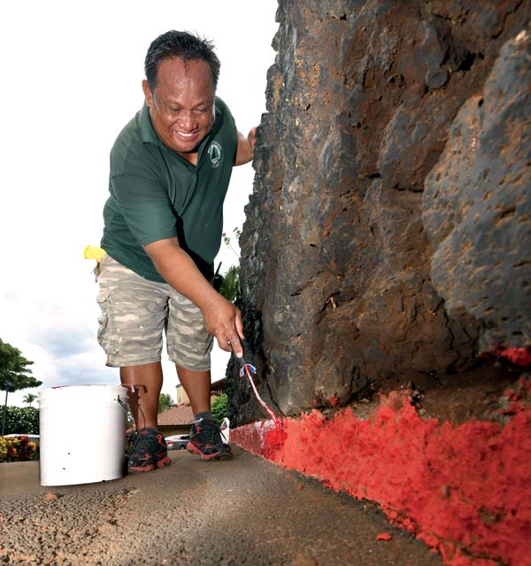 Maui Schooner Resort maintenance man Chris Allejo paints a fire lane curb bright red Tuesday morning in Kihei. Allejo said his job requires him to do many different duties around the oceanfront property.