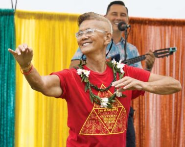 FIRST PHOTO: Oahu kumu hula Brad Lum dances to the song “Kamana Ula” sung by Cody Pueo Pata on the main stage of Saturday’s Aloha Maui Pride Festival at Maui Nui Botanical Gardens in Kahului. Lum kicked off the weeklong event with a sunrise blessing atop Haleakala and helped finish it off Sunday while conducting an ‘awa ceremony. Lum said a big part of the event was honoring the kupuna and brothers and sisters who “paved the way for what we have today, including marriage rights and transgender rights.”