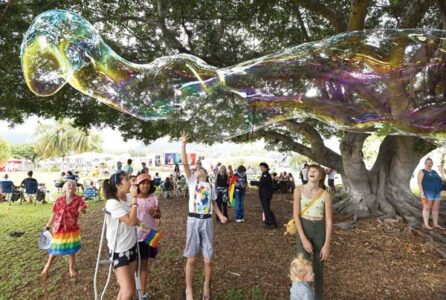 SECOND PHOTO: Dash Christian-Dobbertin, 10, jumps to burst a long soap bubble. Loea Ho’opai, 12, (with crutches) said the event was about “celebrating people who mean the most to you and celebrating people who are different.”