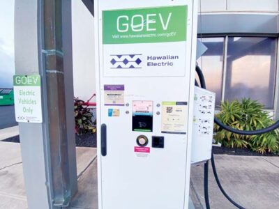 - An electric vehicle charger is seen outside Hawaiian Electric in Kahului in March. The Maui News / COLLEEN UECHI photo