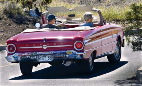 SECOND PHOTO: Ann Garwood (left) and Nancy Moors take off in style in their 1963 Ford Falcon Futura Thursday.