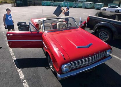 FIRST PHOTO: Kihei’s Nancy Moors (left) and Ann Garwood drop off their recycling Thursday in Kihei while cruising in their 1963 Ford Falcon Futura convertible named Ruby. They said they were celebrating their ninth wedding anniversary, and once the chores were done, planned to have a nice lunch at La Poblana Mexican restaurant.