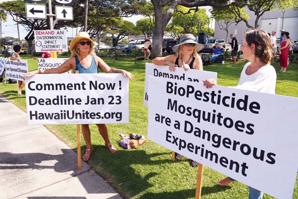 Sign wavers opposed to the plan by the National Park Service and state Department of Land and Natural Resources to release lab-raised mosquitoes to reduce avian malaria in endangered birds line Kaahumanu Avenue Saturday afternoon. Event organizer and Hawaii Unites founder Tina Lia (right) said she opposed the project for a variety of reasons, including the possibility of the “biopesticide drift” of released mosquitoes moving into inhabited areas. “We’re out here to let people know the serious risk of the project to native birds, the environment and to the public health,” Lia said.