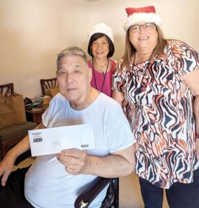 - Paul Kawaguchi displays his $50 Foodland gift card, donated by health insurer AlohaCare, with MEO Maui Planning and Coordinating Council Coordinator Zilpah Kaimiola (right) and specialist Flor Andrion. Kaimiola and Andrion made the rounds at Hale Mahaolu Ekolu on Dec. 21, delivering the gift cards to kupuna residents. — Photo courtesy of MEO