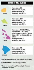 KAUAI: New cases: 69 • Total cases: 19,020 • Average cases: 9 • Positivity rate: 9.7%