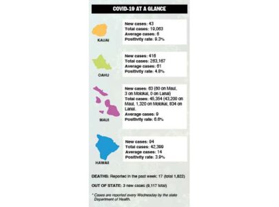 OAHU: New cases: 416 • Total cases: 263,167 • Average cases: 61 • Positivity rate: 4.8%