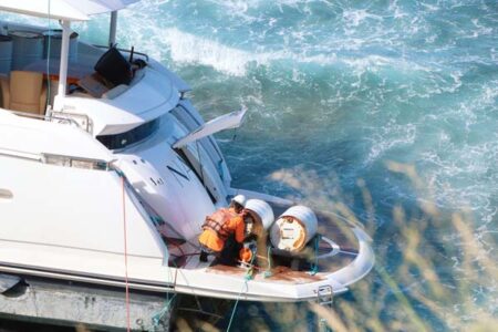 Sea Engineering President Andrew Rocheleau said the time to defuel the luxury yacht took longer because the vessel is leaning to one side at the shoreline, so fuel moved into baffles within the boat’s 2,400-gallon tank.