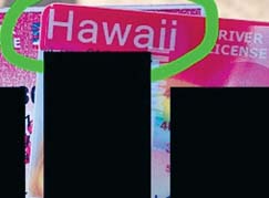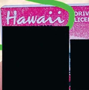 - A partially blacked out driver’s license properly printed with “Hawaii” in script font. DOT photos