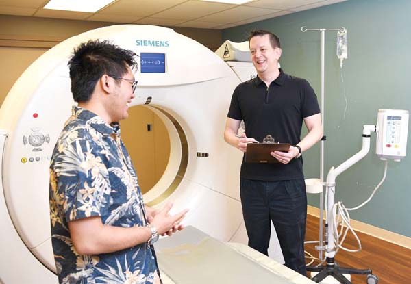 Maui Diagnostic Imaging Medical Director Dr. Andrew Kayes, M.D., (right) talks with X-ray technologist Lyster Estoconing in front of a multislice CT scanner Friday morning in Kahului. Kayes, a radiologist, says it is unfair and inequitable to tax people for health care and is one of the physicians supporting a bill that would exempt medical providers from the state general excise tax for treating patients with Medicare, Medicaid and TRICARE. — The Maui News / MATTHEW THAYER photo