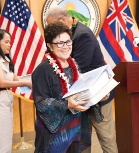 - Maui County Council Chairwoman Alice Lee receives the first copy of Mayor Richard Bissen Jr.’s budget Friday. — The Maui News / MATTHEW THAYER photo